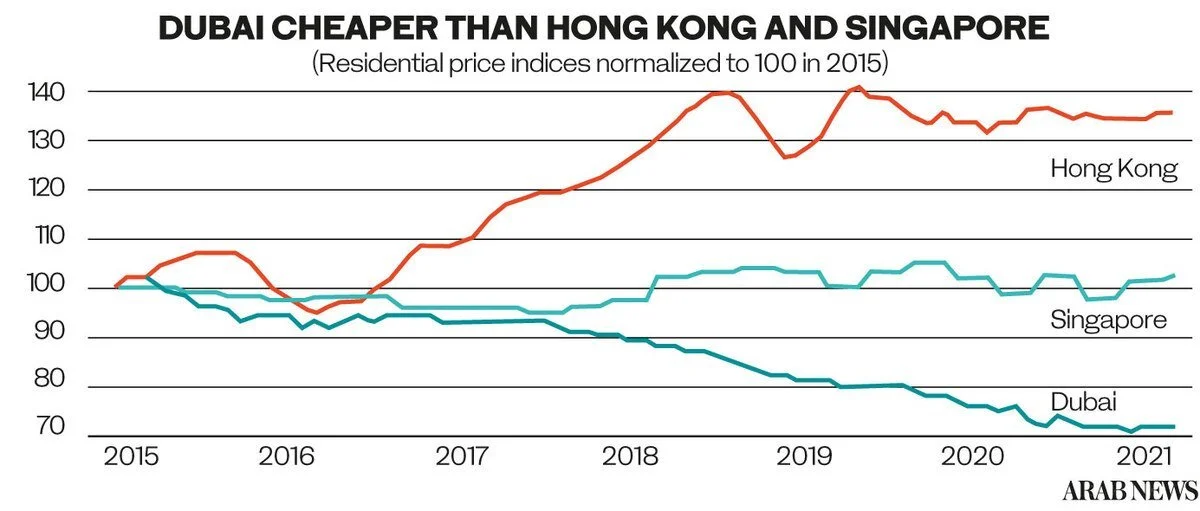 “The main driver of this competitiveness is residential property prices, which, since the start of 2015, are up 35 percent in Hong Kong, flat in Singapore, and down 30 percent in Dubai,”